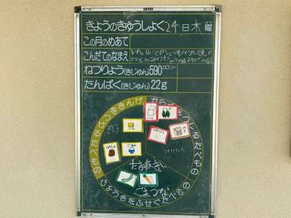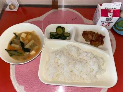 今日の給食は、鶏肉の醤油バター焼き、小松菜の味噌汁、きゅうりの和え物です。