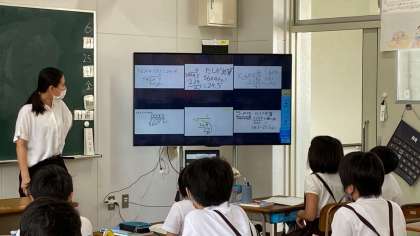少人数グループで考えをまとめた後、大型モニターを使って全体交流を行います。