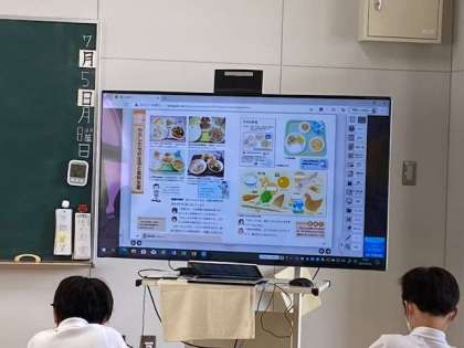 1組では、日本全国の給食を見て、その特徴に気付きます。「大阪の名産品は?」の問いに、子どもたちからは、「たこ焼き」「お好み焼き」!