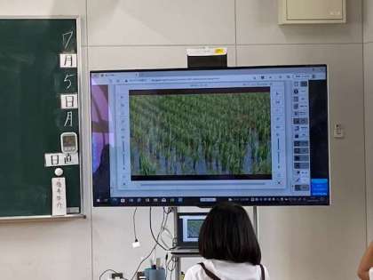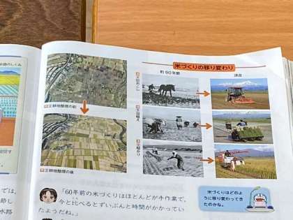 2組では、米の生産について学習しています。生産性を上げるため、農家の人々の工夫と労力について学んでいきます。60年前と現在の米作りの違いについて気付いたことを、話し合ってまとめていきます。