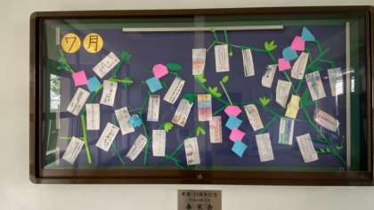 正門に入ってすぐの掲示板に、たくさんの短冊が飾られています。もうすぐ七夕ですねー。いろいろな願いごとが書かれています。