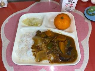 今日の給食は、夏野菜のカレーライス、キャベツのサラダ、冷凍みかんです。