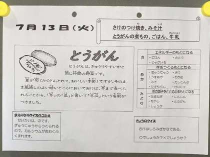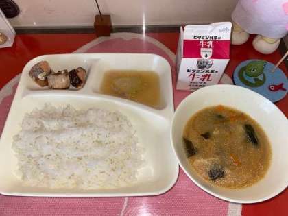 今日の給食は、鮭の漬け焼き、味噌汁、冬瓜の煮物です。