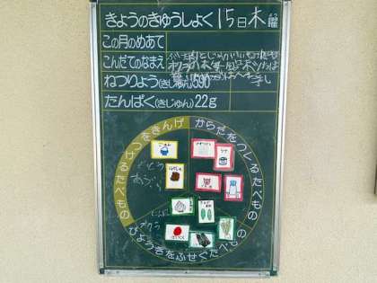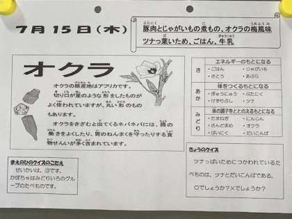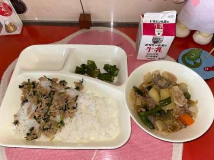 今日の給食は、豚肉とじゃがいもの煮物、オクラの梅風味、ツナっ葉炒めです。