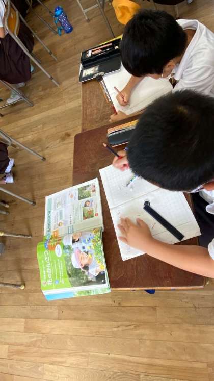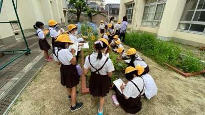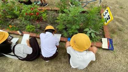 3年生の理科では、「花の観察」の授業中。教室で今日の授業めあてを決めた後、学習園に移動。ヒマワリ、ホウセンカ、マリーゴールドのうち1つを選択し、葉や花の特徴を観察、記録していきます。