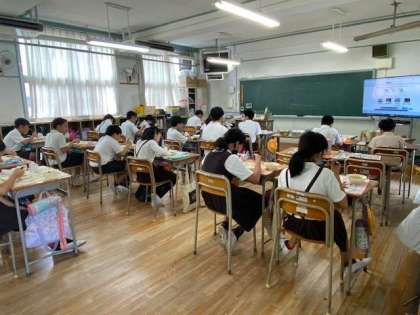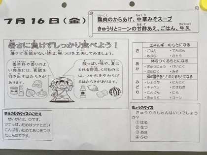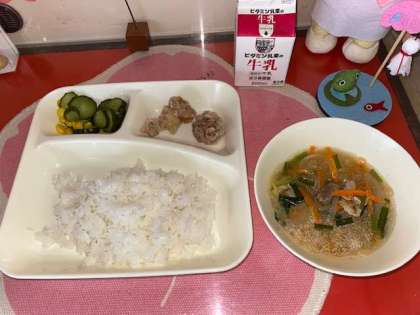 今日の給食は、鶏肉の唐揚げ、中華味噌スープ、きゅうりとコーンの甘酢和えです。