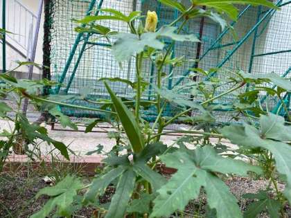 学校の学習園の植物は、太陽の日をいっぱい浴びて、すくすくと育っています。ひょうたんやへちま、きゅうり、おくらなど大きく成長中。おくらは、なんと15cm!育ち過ぎていませんか?