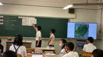 大仙古墳のおよその面積を縮図を利用して求めていきました。形が既習図形ではないので、工夫が必要です。しかし、さすが6年生!すかさず、図形を2つに分けた考えるなど、意見がでました。