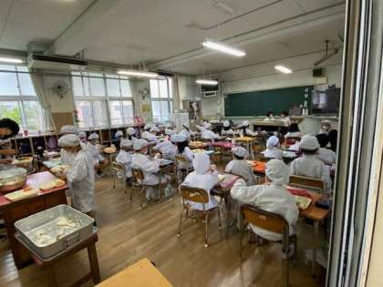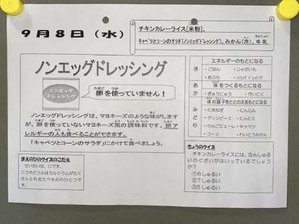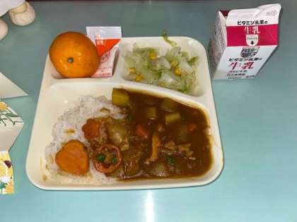 今日の給食は、チキンカレーライス、キャベツとコーンのサラダ、冷凍みかんです。