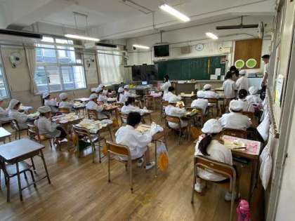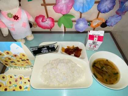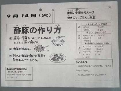 今日の給食は、酢豚、中華みそスープ、焼きのりです。