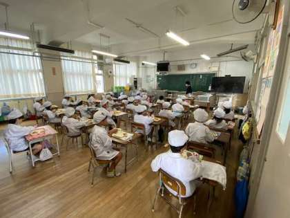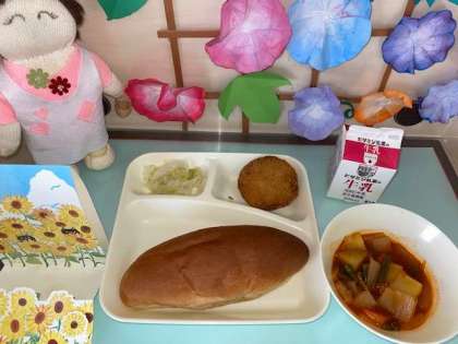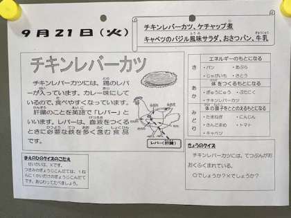 今日の給食は、チキンレバーカツ、ケチャップ煮、キャベツのバジル風味サラダです。