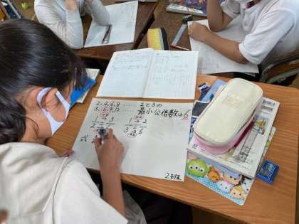 分母の違う分数の足し算。ポイントは、「通分」できるかどうかです。通分には、最小公倍数が必要となります。班活動を行うことで、考えを深めていきます。最後は発表して、解法を確かめました。