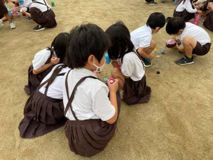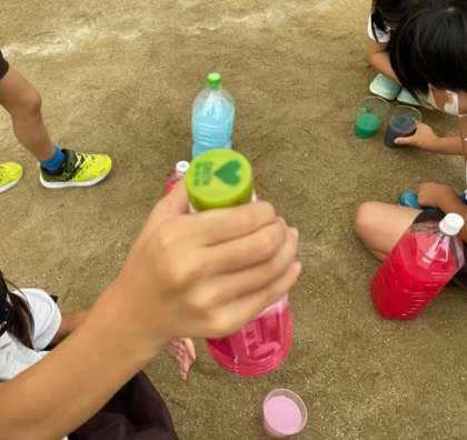 5時間目は、カラフル色水をしました。友だちと色の交換をして、混ぜて、お気に入りの「カラフル色水」を作りました。