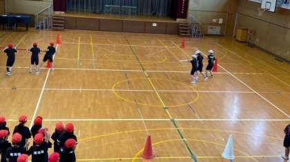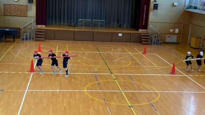 後半は、「台風の目」。竹の棒を3〜4人で持ち、三角コーンの周りをクルッと回ります。