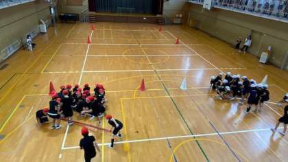 戻って来たら、チームの足元と頭上を棒が通りますが、スムーズ通っている組が勝利に近づきます。
