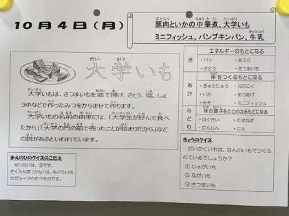 今日の給食は、豚肉といかの中華煮、大学芋、ミニフィッシュです。