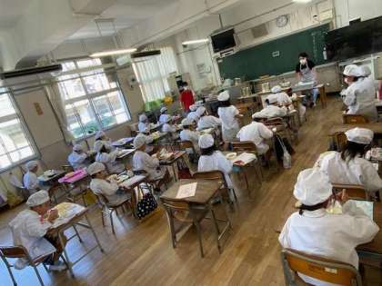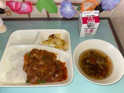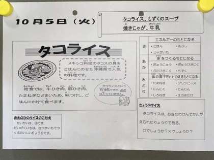 今日の給食は、タコライス、もずくのスープ、焼きじゃがです。