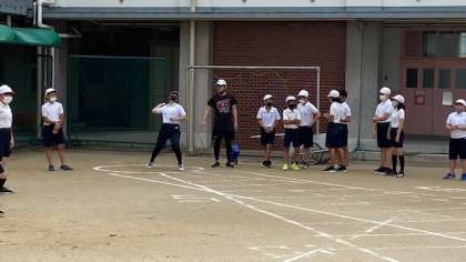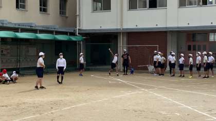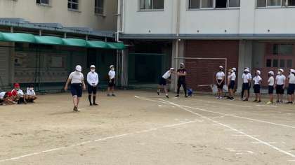 6年生と1年生が、ソフトボール投げにチャレンジ。まずは、6年生のお兄さん、お姉さんがお手本に。