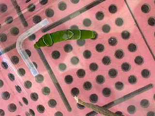 休み時間に、アゲハチョウの幼虫を見つけました。学校にはアゲハチョウが主食としている柑橘類の木は無いのですが、学習園のマリーゴールドの畑にいたそうです。見つけた子が、とてもうれしそうに、話していました。