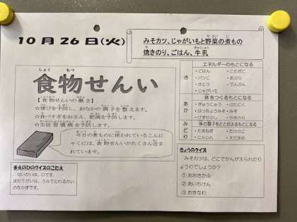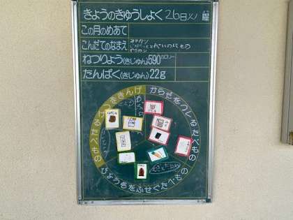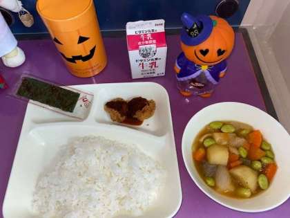 今日の給食は、味噌カツ、ジャガイモと野菜の煮物、焼き海苔です。