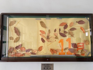 11月の玄関掲示は、1年生のみんなで作りました。「秋みつけ」で、見つけた落ち葉をたくさん作りました。
