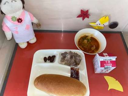 今日の給食は、豚肉のガーリック焼き、ケチャップ煮、うずら豆のグラッセです。