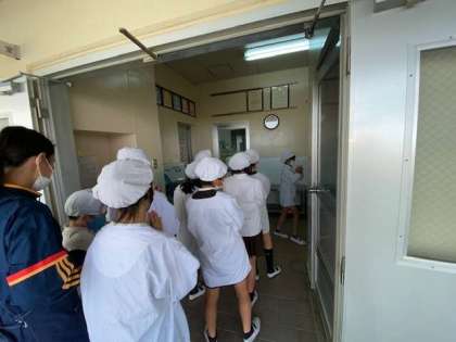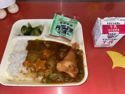 今日の給食は、エビフライカレーライス、ブロッコリーのサラダ、ソフト黒豆です。