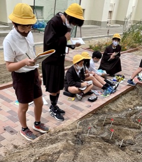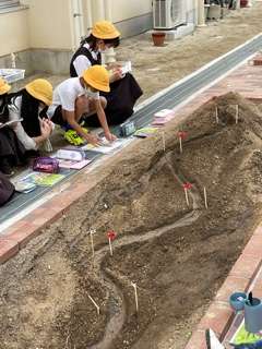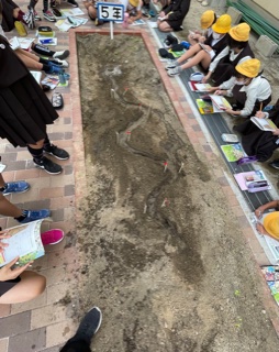 学習園を耕し、土で山を造って水を流し、流れの様子や流れた後の地面の変化の様子を調べました。