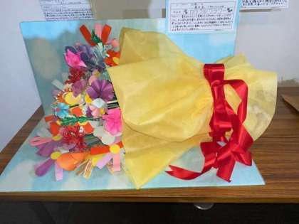 色とりどりのお花が手作りされています。細かな手作業だったのがわかります。少し離れた所から見ると、本物の花束に見えます。