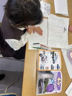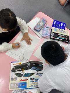 今日の国語科の学習では、「いろいろなふね」で学んだ文の構成(はじめ・なか・おわり)をいかして、オリジナルの乗り物カードを作っています。