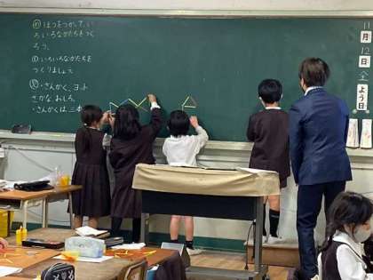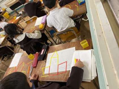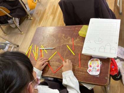 今日は、棒を使っていろいろな形を作る授業です。お魚、ヨット、お城、、。どこから作ろう?棒は何本いるのかな?作り方をグループで発表。「こんなのができたよ。」見本とは違う形を作った子もいます。柔軟な発想を持っていますね。