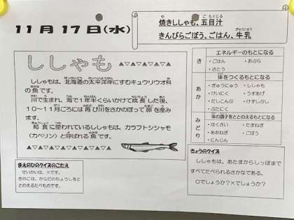 今日の給食は、焼きししゃも、五目汁、きんぴらごぼうです。