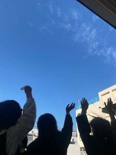 つばさをひろげて、ぐるぐると飛び回る「トンビ」でした。始めは1羽でしたが、続いてもう1羽も現れて、みんなで「おーい。」「おーい。」と呼びかけました。子どもたちは、めずらしい鳥の登場に、大喜びでした。