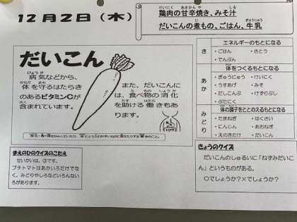 今日の給食は、鶏肉の甘辛焼き、味噌汁、大根の煮物です。
