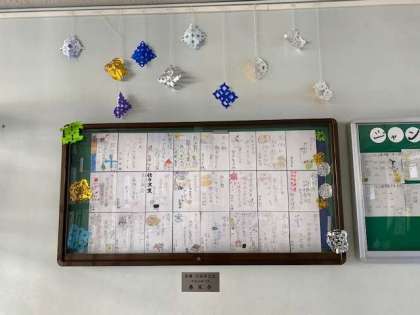 正面玄関に、5年生が作成した冬に関する俳句を掲示しています。