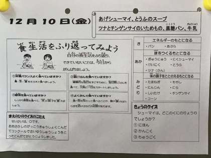 今日の給食は、揚げ焼売、豆腐のスープ、ツナとチンゲンサイの炒め物です。