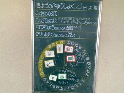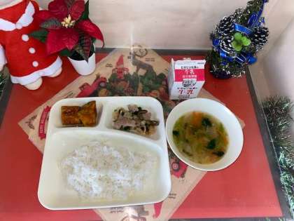 明日22日は、「冬至」です。今日の給食には、かぼちゃ(なんきん)を出しました。かぼちゃには、ビタミンや食物繊維が多く含まれています。栄養をちゃんと摂取して健康な身体を作りましょう!