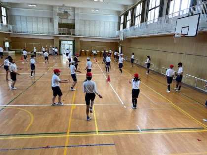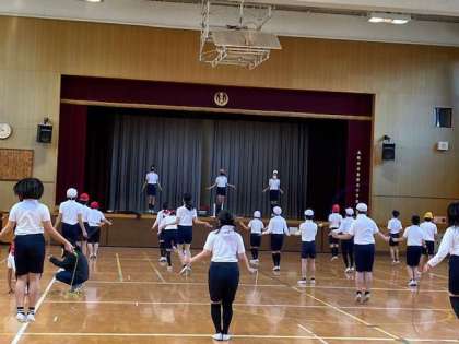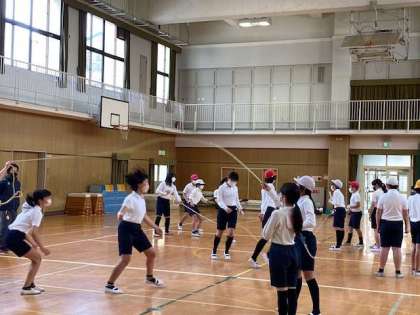 縄跳びを「サザエさん」の曲に合わせて、片足やかけ足で跳ぶなどいろんな跳び方で跳んでいきます。さすが6年生!あや跳び、二重跳びもしっかりできています。続いて、大縄跳びをタイミング合わせて、上手に跳んでいきます。3分間で何回跳べるか!力を合わせて!