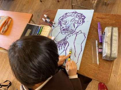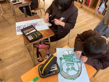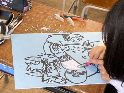 鬼の版画を作成中。いろんなお顔の鬼が登場!皆さん、彫刻刀を上手に使っていますねー。出来上がりが楽しみです^_^