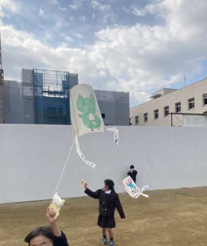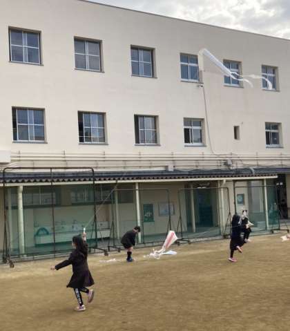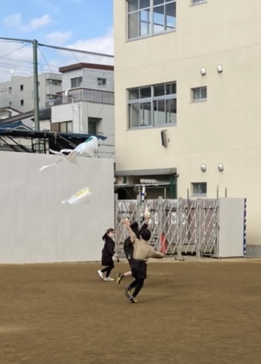 昨日、1組は生活科の冬あそびで、たこあげをしました。2組は、明日します。