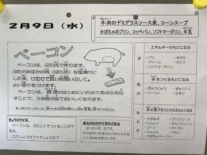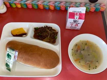 今日の給食は、牛肉のデミグラスソース煮、コーンスープ、かぼちゃのプリンです。