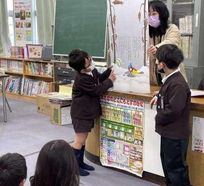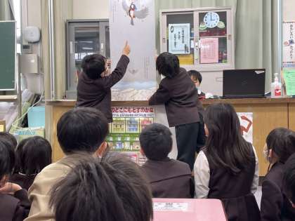 2組では、図書係タイムで「そらの100かいだてのいえ」を読み聞かせしました。図書係の二人は、前もって読む練習をして、役割を決めて、読み聞かせをしました。とても上手だったので、みんなは聞き入っていました。