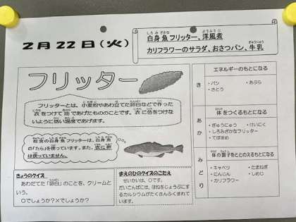今日の給食は、白身魚のフリッター、洋風煮、カリフラワーのサラダです。