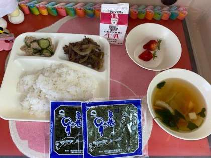 今日の給食は、手巻きご飯(牛肉の甘辛煮、ツナソテー)、すまし汁、イチゴです。