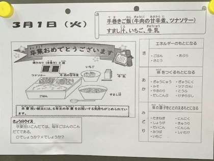 3月に入りました。卒業式まで18日となりました。今日は、卒業お祝い献立として、手巻きご飯にしています。綺麗に巻けて食べられましたか?