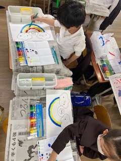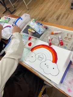 図工科の学習では、昨日の続きで絵の具を使って、虹の色塗りをしました。いろいろな色を使って、きれいに塗り分けし、カラフルな虹が仕上がりました。