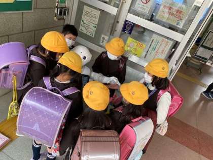 朝のあいさつ運動には、ペッパーさんが登場!子どもたちに囲まれて、楽しそうです。5年生が、プログラミングの授業で組み上げたプログラムで、話しをしたりクイズを出したり、手をあげたり、、。