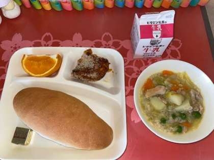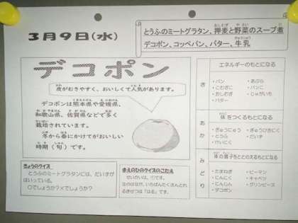 今日の給食は、豆腐のミートグラタン、押し麦と野菜のスープに、デコポンです。