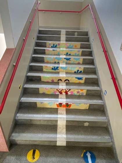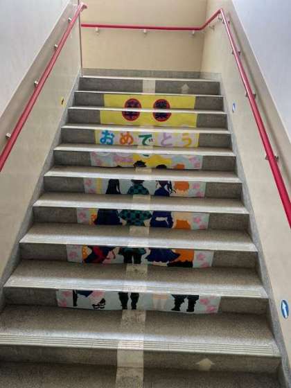 南館の多目的室、音楽室に続く階段に、何やら絵が貼ってあります。