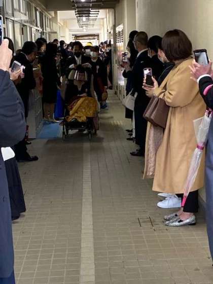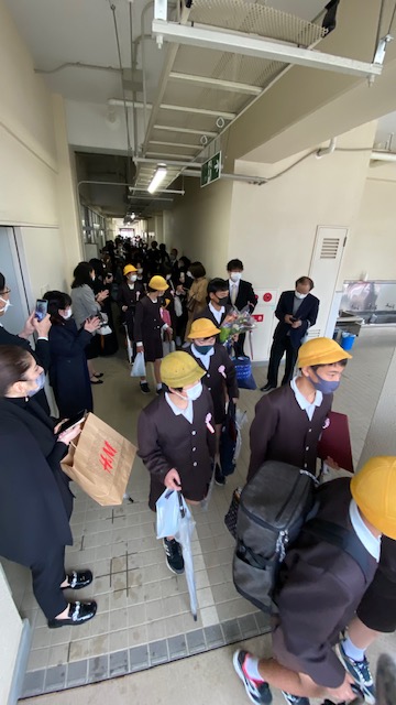 卒業証書授与式後、保護者の皆様、在校生、教職員が花道を作り、笑顔と涙目が入り混じって、巣立っていきました。